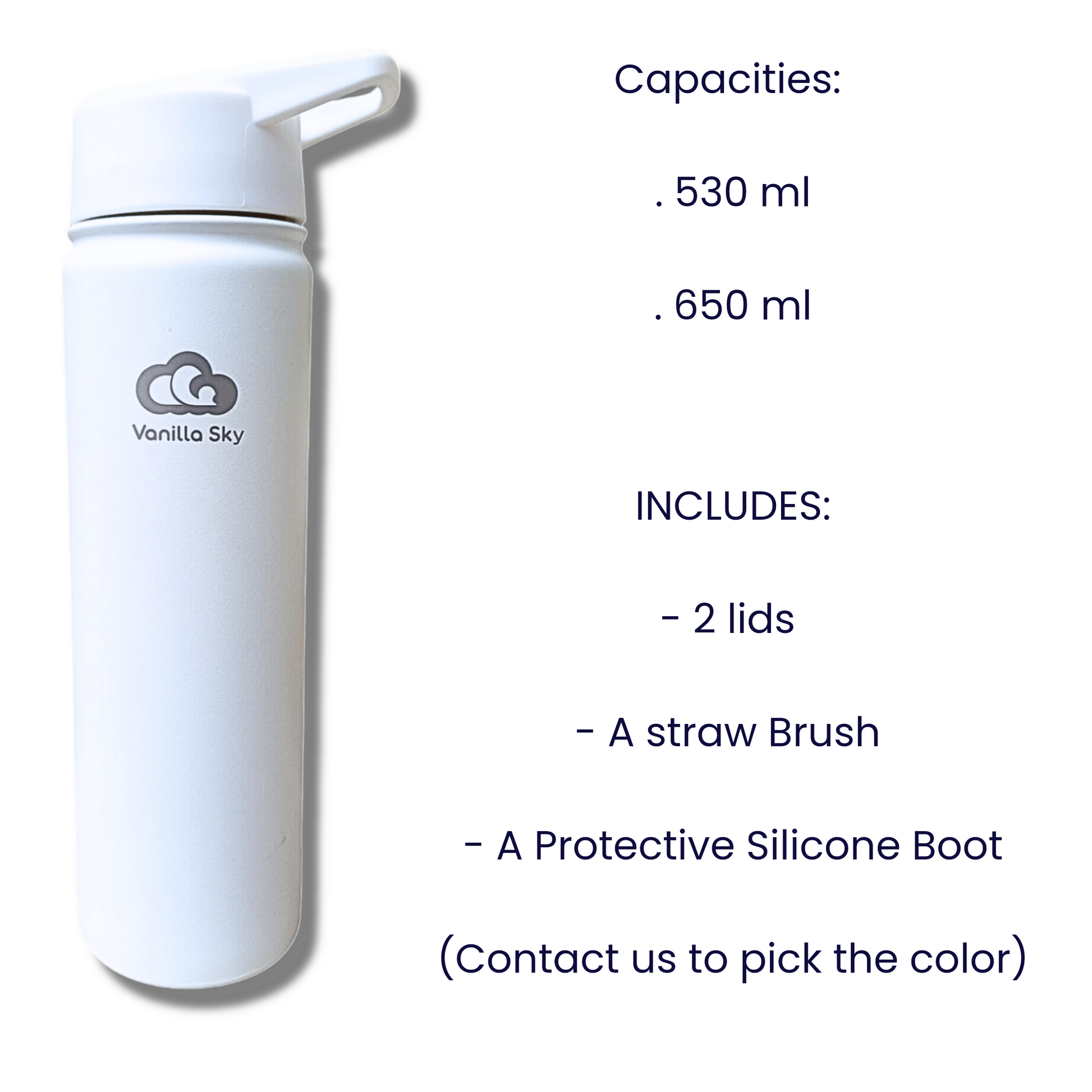 530 ml (18 oz) & 650 ml (22 oz) - Cloud 9 Insulated Water Bottle, 2 lids and silicone boot